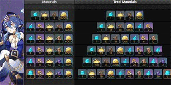 20级突破材料: 20000摩拉,哀叙冰玉碎屑1个、月莲3个、 导能绘卷3个